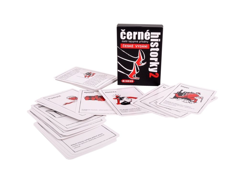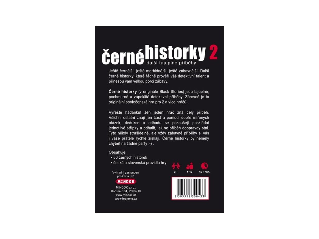 Ještě černější, ještě morbidnější, ještě zábavnější. Další černé historky, které řádně prověří váš detektivní talent. 50 nových příběhů, které vám přinesou velkou porci zábavy. Černé historky (v originále Black Stories) jsou tajuplné, pochmurné a zapeklité detektivní příběhy. Zároveň je to originální společenská hra pro 2 a více hráčů.