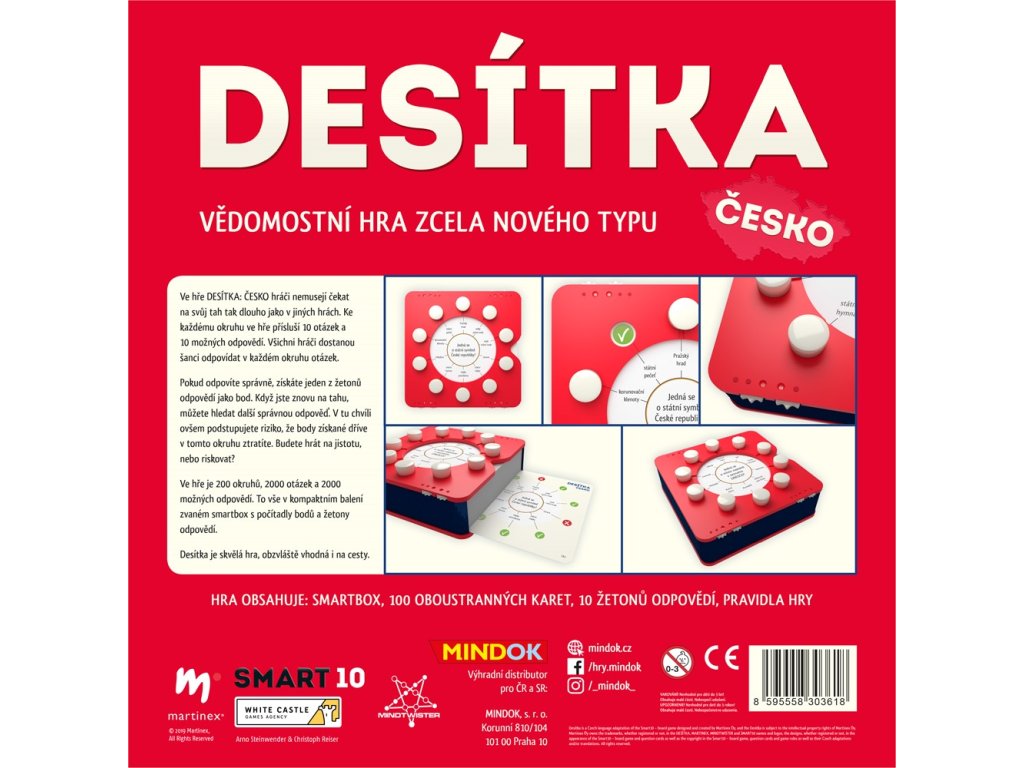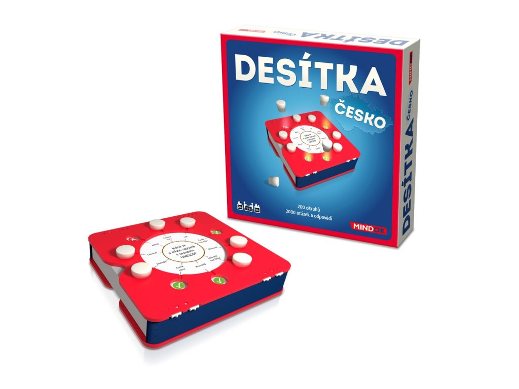 Desítka – Česko obsahuje 200 tematických okruhů zaměřených na české reálie, tedy celkem 2000 otázek a odpovědí. Vše je prakticky uspořádáno ve Smartboxu, který slouží jako úložný prostor, počítadlo bodů i nástroj ke hře samotné. Kompaktní balení oceníte doma i na cestách.