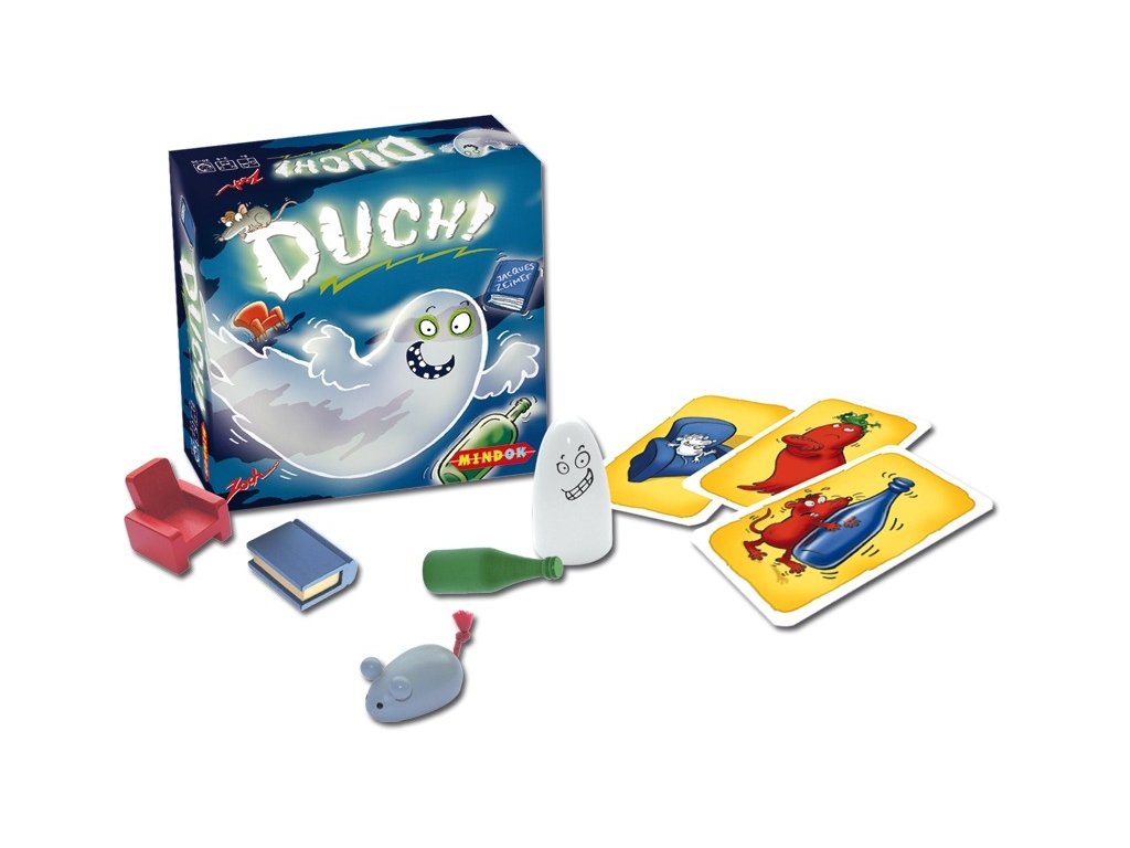 Ve hře najdete 5 dřevěných předmětů – bílého ducha, zelenou láhev, modrou knihu, červené křeslo a šedou myš. Na kartách jsou vždy dva z těchto předmětů, ale pozor, barvy často neodpovídají realitě!