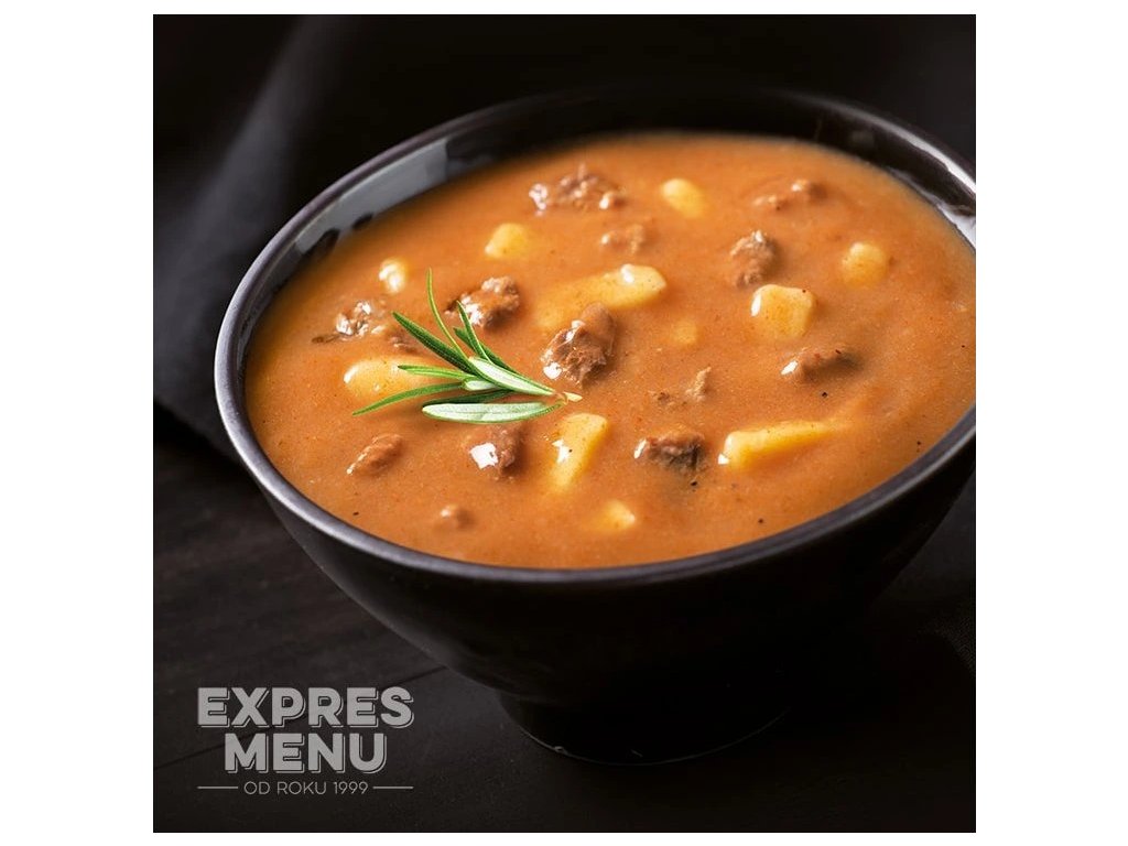 Vydatná svačinová polévka s kousky hovězího masa a brambor. Maso je orestované na cibulce a paprice, zalité hovězím vývarem. Polévka je dochucená majoránkou a česnekem.