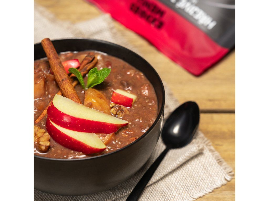 Kaše je z ovesných vloček a zlatého lněného semínka, doplněná o kousky jablek se skořicí.