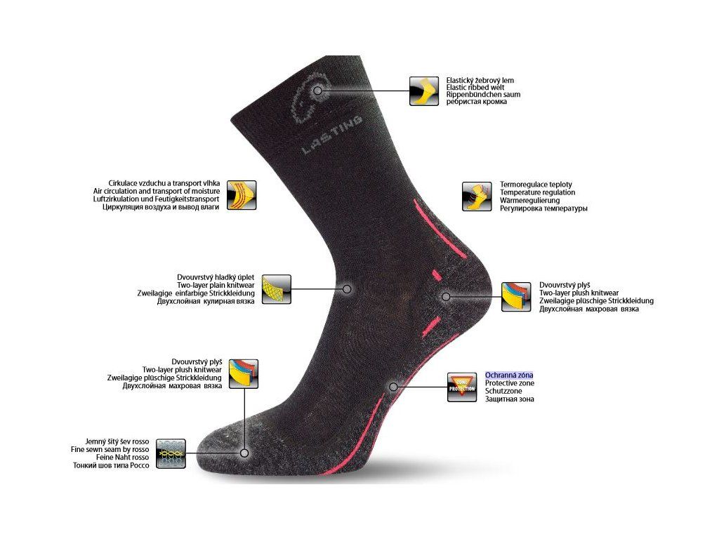 Lasting WHI jsou středně silné trekingové ponožky s vysokým podílem merino vlny, která poskytuje výbornou tepelnou izolaci, efektivní odvod vlhkosti a maximální komfort při celodenním nošení. Díky dvouvrstvému hladkému úpletu je ponožka příjemná na dotek a zároveň dostatečně odolná pro náročné outdoorové aktivity. Zesílené partie v oblasti paty, Achillovy šlachy a špičky zajišťují zvýšenou ochranu proti otlakům a delší životnost. Přirozené antibakteriální vlastnosti merino vlny navíc pomáhají redukovat vznik nepříjemných pachů.