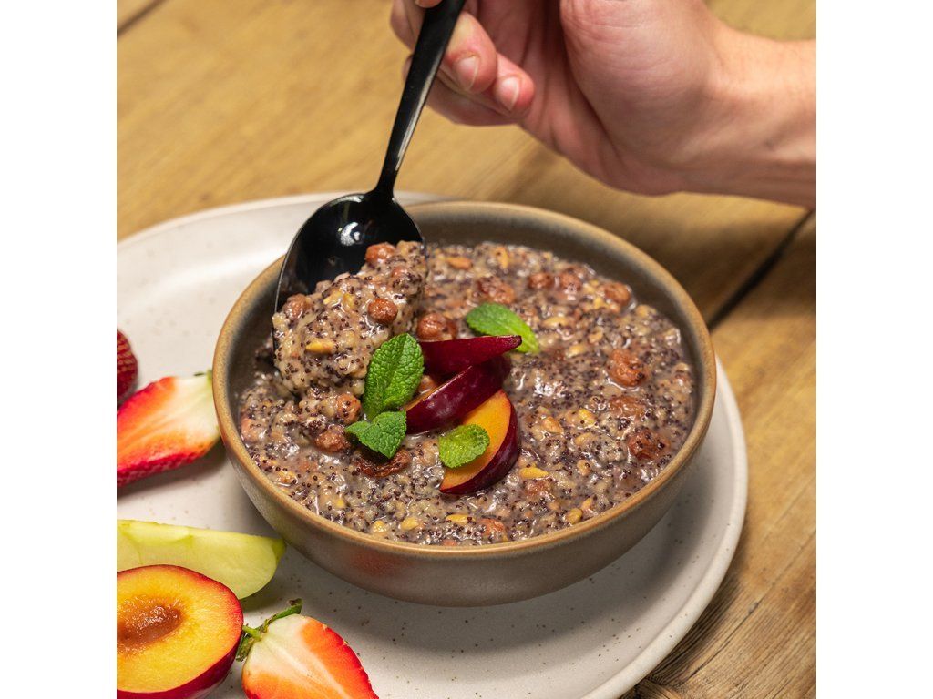 Bohatá maková kaše se švestkami a rozinkami, zjemněná ghí máslem a jemně provoněná špetkou kardamonu.