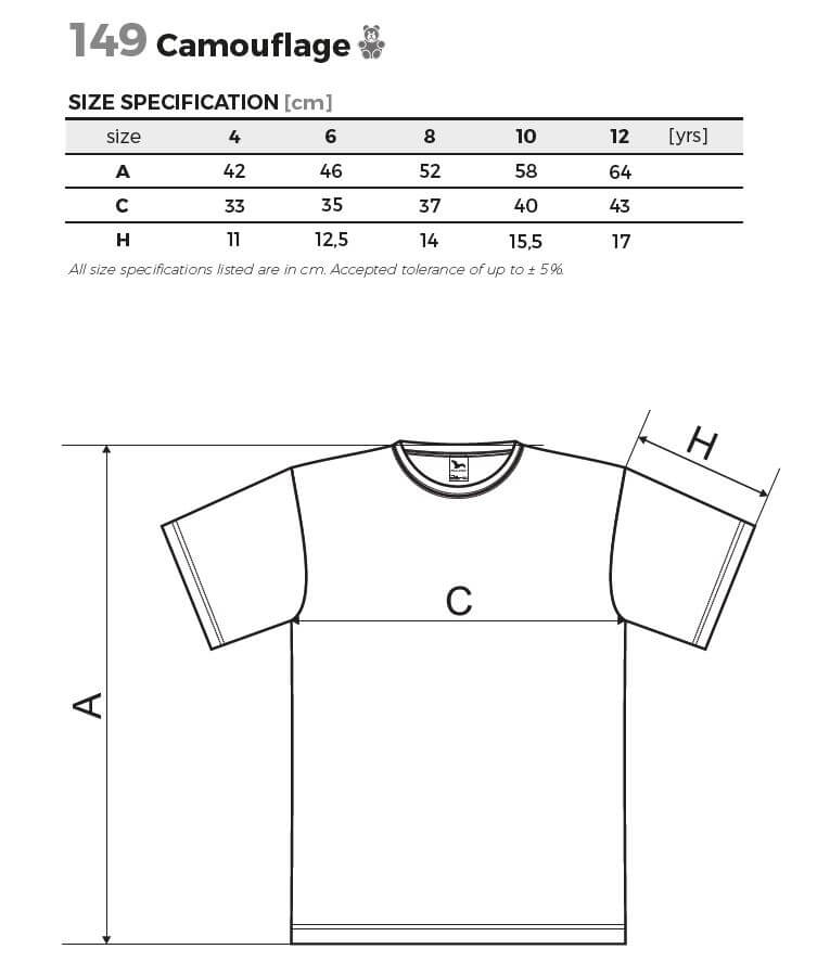 Dětské maskáčové triko z kvalitní bavlny. Má pohodlný unisex střih s bočními švy, kulatý výstřih se zeleným lemem a pevně zpracované ramenní švy pro delší životnost. Příjemný materiál o gramáži 160 g/m² a maskáčový potisk z něj dělají ideální volbu pro každodenní nošení i venkovní dobrodružství.