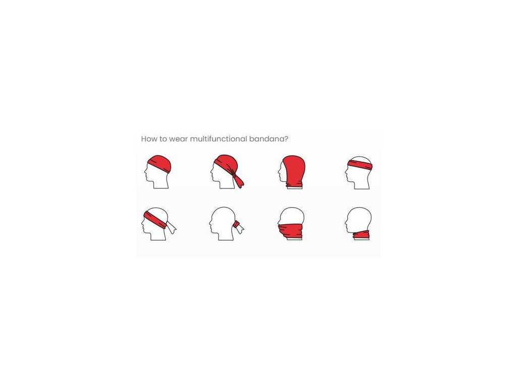 Šátek lze nosit mnoha způsoby – jako celoplošnou pokrývku hlavy, čelenku, kuklu, masku, šálu, šátek nebo gumičku do vlasů. Díky své univerzálnosti je ideální pro sport, turistiku i každodenní nošení.