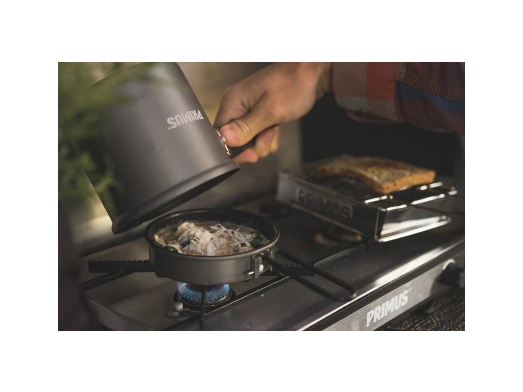 Univerzální komplet nádobí ideální pro jednoho cestovatele. Konvice může sloužit jako hrnec či ešus a poklička se dá snadno použít i jako pánev. Obě části mají skládací držadla, takže v batohu nezaberou skoro žádné místo. Dovnitř se vejde menší plynová kartuše i malý vařič. Konvice je vyrobena z tvrdě eloxovaného hliníku, který je zevnitř potažen několika vrstvami titanu, takže kromě mimořádně malé hmotnosti nabízí ještě nelepřilnavý povrch, na kterém se nic nepřipaluje. Celý set je zabalena do praktického síťovaného přepravního sáčku.
