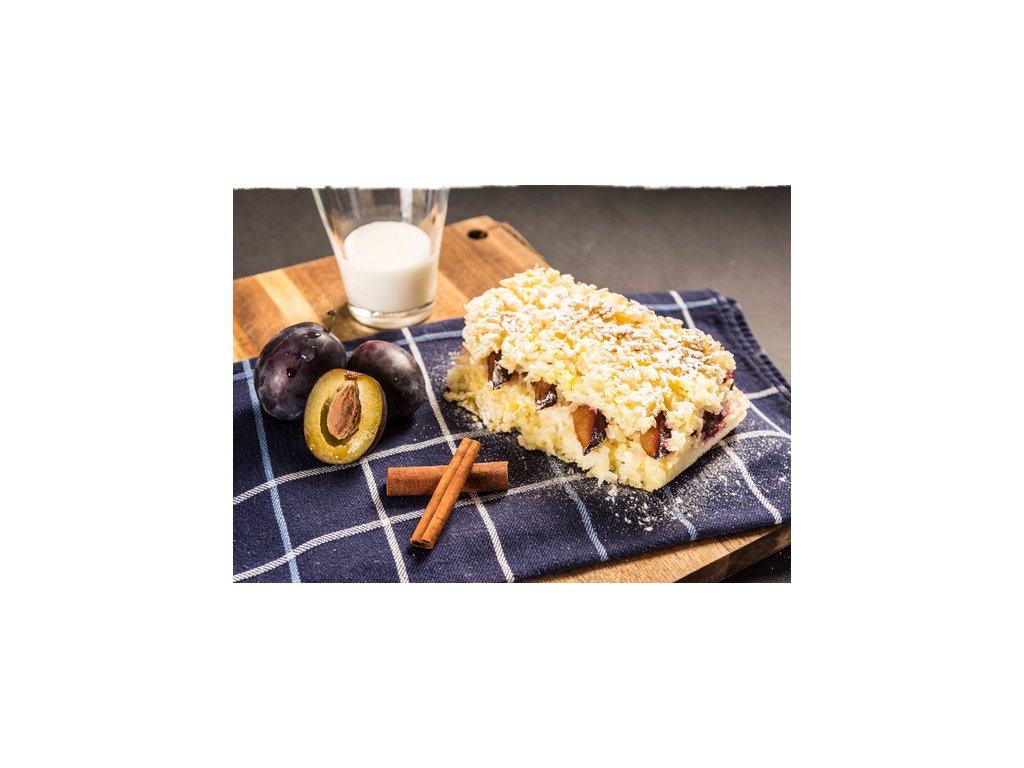 Složení: mléko, švestky kompotované (24%)(švestky, voda, cukr), rýže ( 15 %), cukr, vejce, máslo, sůl, skořice.