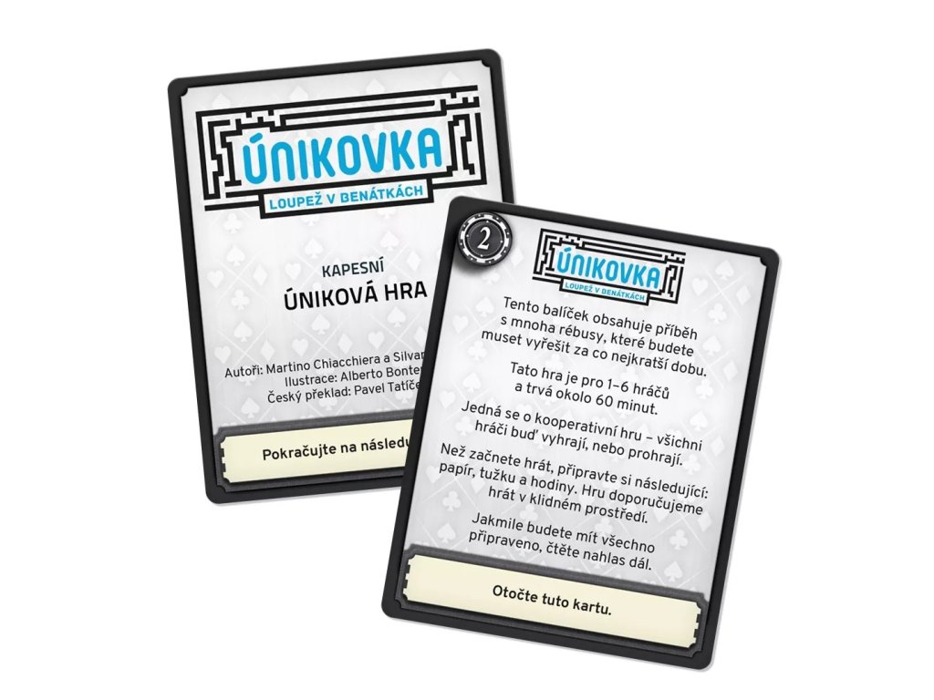 Karetní únikovka je hra plná hádanek a rébusů, kterou může hrát jeden hráč nebo skupina. Inspirována klasickými únikovými místnostmi, kde se snažíte v časovém limitu vyřešit sérii úkolů a „uniknout“, přenáší podobný zážitek ke stolu – pomocí karet, bez nutnosti speciálního prostoru. Hráči postupně odhalují karty s novými úkoly, nápovědami i předměty a společně (nebo sami) se snaží dojít až do konce.