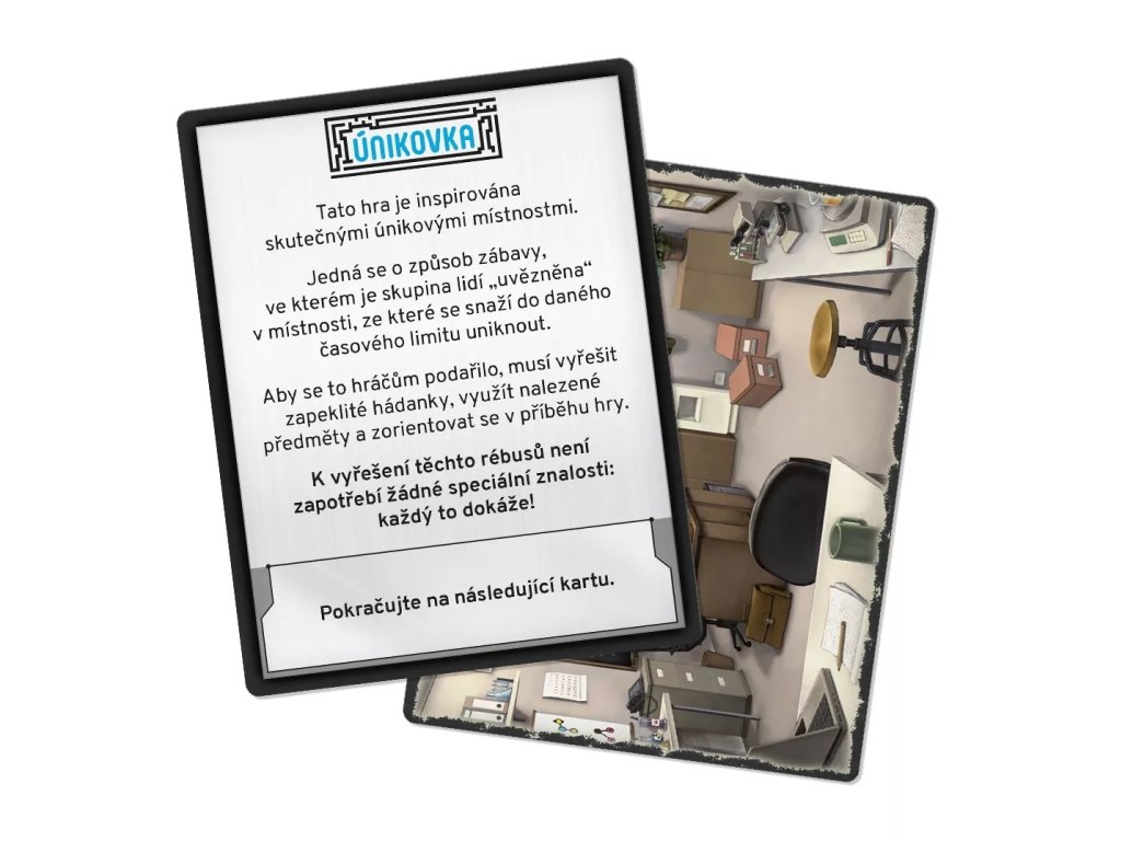 Karetní únikovka je hra plná hádanek a rébusů, kterou může hrát jeden hráč nebo skupina. Inspirována klasickými únikovými místnostmi, kde se snažíte v časovém limitu vyřešit sérii úkolů a „uniknout“, přenáší podobný zážitek ke stolu – pomocí karet, bez nutnosti speciálního prostoru. Hráči postupně odhalují karty s novými úkoly, nápovědami i předměty a společně (nebo sami) se snaží dojít až do konce.