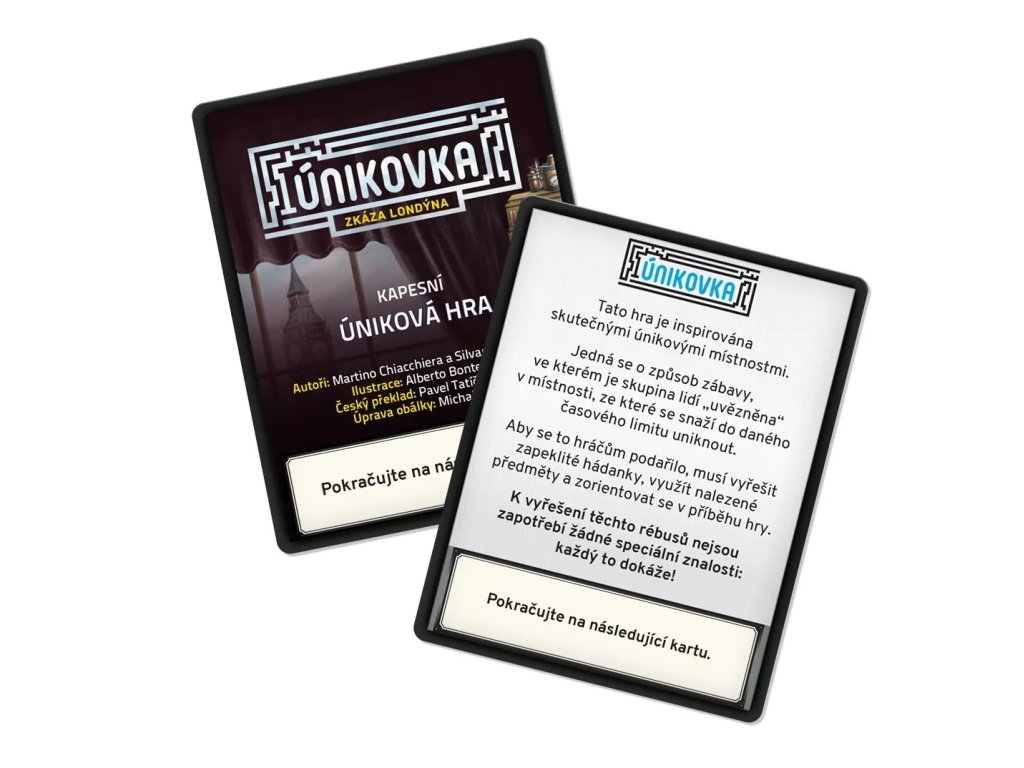 Karetní únikovka je hra plná hádanek a rébusů, kterou může hrát jeden hráč nebo skupina. Inspirována klasickými únikovými místnostmi, kde se snažíte v časovém limitu vyřešit sérii úkolů a „uniknout“, přenáší podobný zážitek ke stolu – pomocí karet, bez nutnosti speciálního prostoru. Hráči postupně odhalují karty s novými úkoly, nápovědami i předměty a společně (nebo sami) se snaží dojít až do konce.