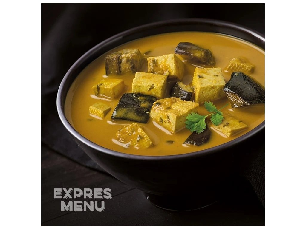 Tradiční thajské jídlo podle originální receptury. Jemná a přitom trochu pálivá omáčka z kokosového mléka s kvalitním tofu a šťavnatým lilkem.